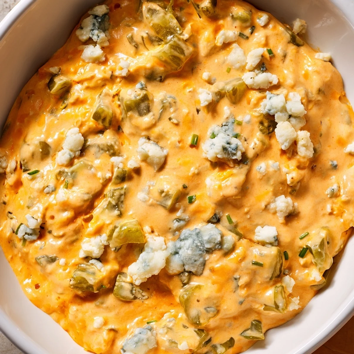 This zesty dip brings together the bold heat of buffalo wing sauce with the fresh crunch of dill pickles. The creamy base blends softened cream cheese with sour cream and mayonnaise, creating a smooth canvas for the tangy flavors. Shredded cheddar and optional blue cheese add richness, while fresh chives and garlic powder round out the seasonings. Ready in just 10 minutes with no cooking required, this versatile spread serves eight and keeps well in the refrigerator for up to two days. Pair with potato chips, pretzels, carrot sticks, or celery for a satisfying appetizer that balances spice and brightness in every bite.