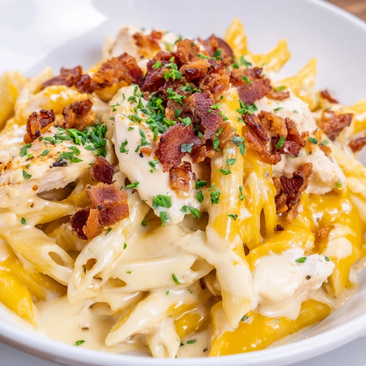 Indulge in tender chicken pieces sautéed to golden perfection, then enveloped in a silky sauce of softened cream cheese, heavy cream, and sharp cheddar. The crispy beef bacon adds a savory crunch throughout, while fresh parsley, chives, and spring onions bring brightness to each bite. Ready in just 45 minutes, this pasta transforms simple ingredients into a luxurious meal that's perfect for weeknight dinners or casual entertaining.