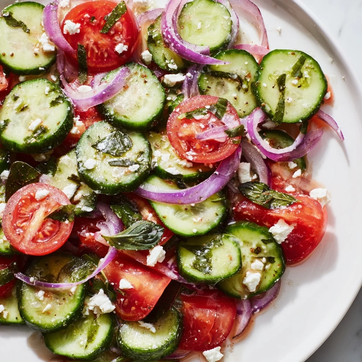 This vibrant Italian-style salad combines crisp sliced cucumbers, ripe diced tomatoes, and thin red onion rings in a tangy homemade dressing. The zesty blend of extra virgin olive oil, red wine vinegar, garlic, and oregano creates classic Mediterranean flavors that perfectly complement fresh summer vegetables.