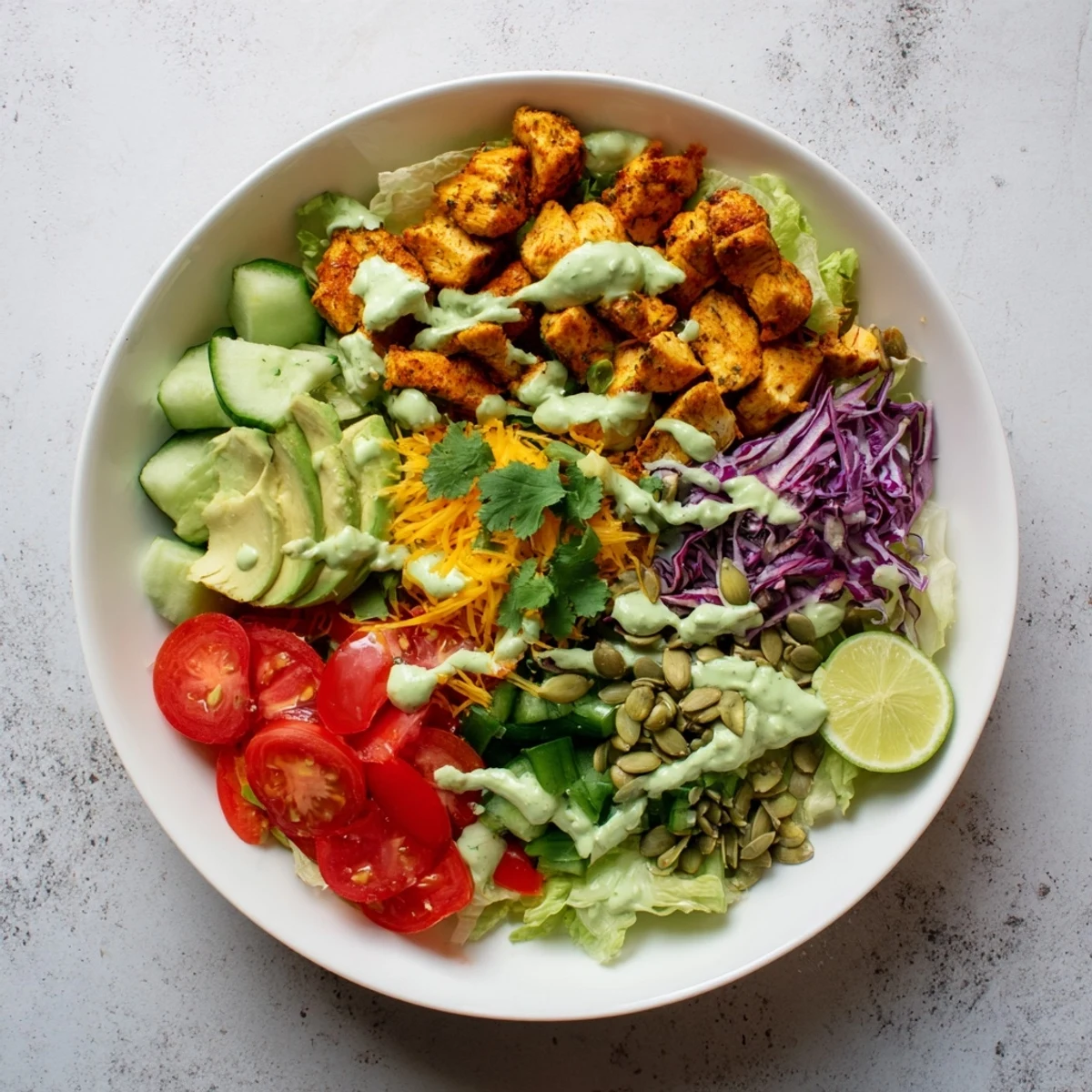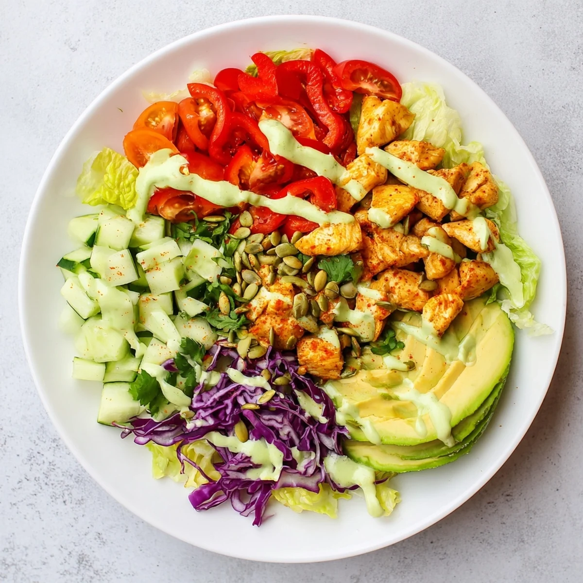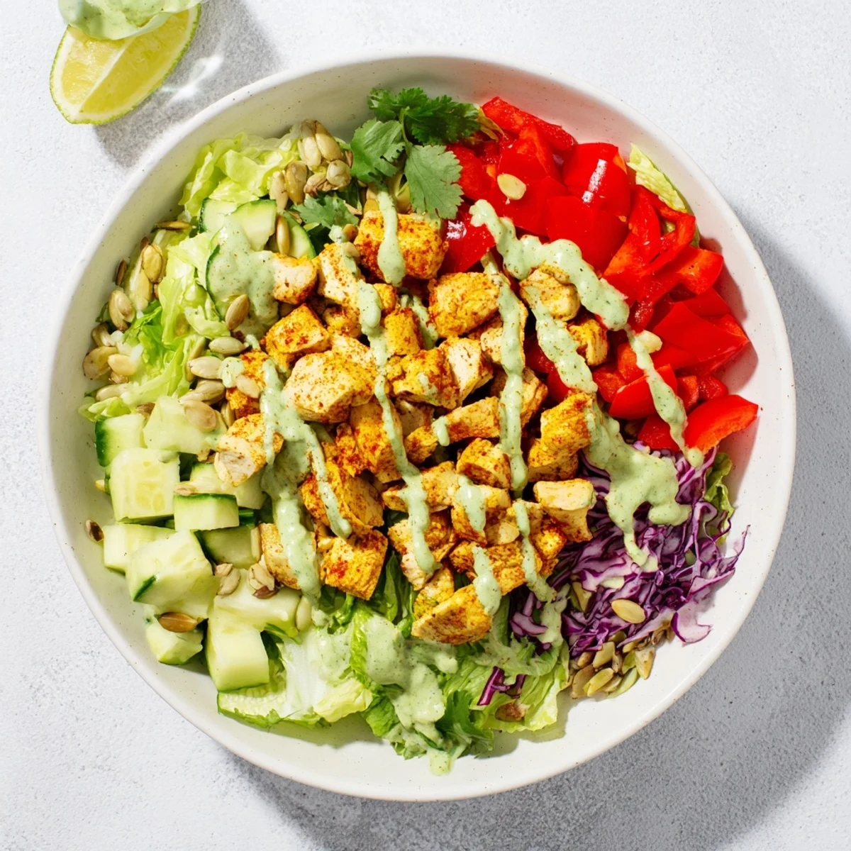 Build your perfect low-carb bowl starting with a crisp romaine foundation topped with seasoned golden chicken, colorful vegetables, and buttery avocado slices. The star is the velvety lime-kissed dressing that brings everything together with bright citrus notes and creamy richness. Each bowl delivers satisfying protein from tender spiced chicken while keeping carbohydrates minimal for your keto lifestyle.