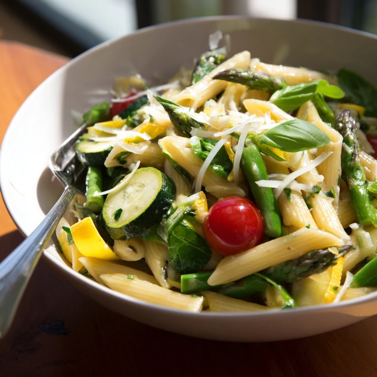 This vibrant one-pot pasta combines tender penne with fresh spring vegetables like asparagus, snap peas, zucchini, cherry tomatoes, and baby spinach. Everything cooks together in vegetable broth, creating a light sauce while the pasta becomes perfectly al dente. Finished with Parmesan, lemon zest, and fresh basil, this dish comes together in just 35 minutes with minimal cleanup. The vegetables maintain their bright colors and crisp-tender texture, while the broth infuses the pasta with subtle flavor. Perfect for weeknight dinners when you want something fresh, satisfying, and effortless.