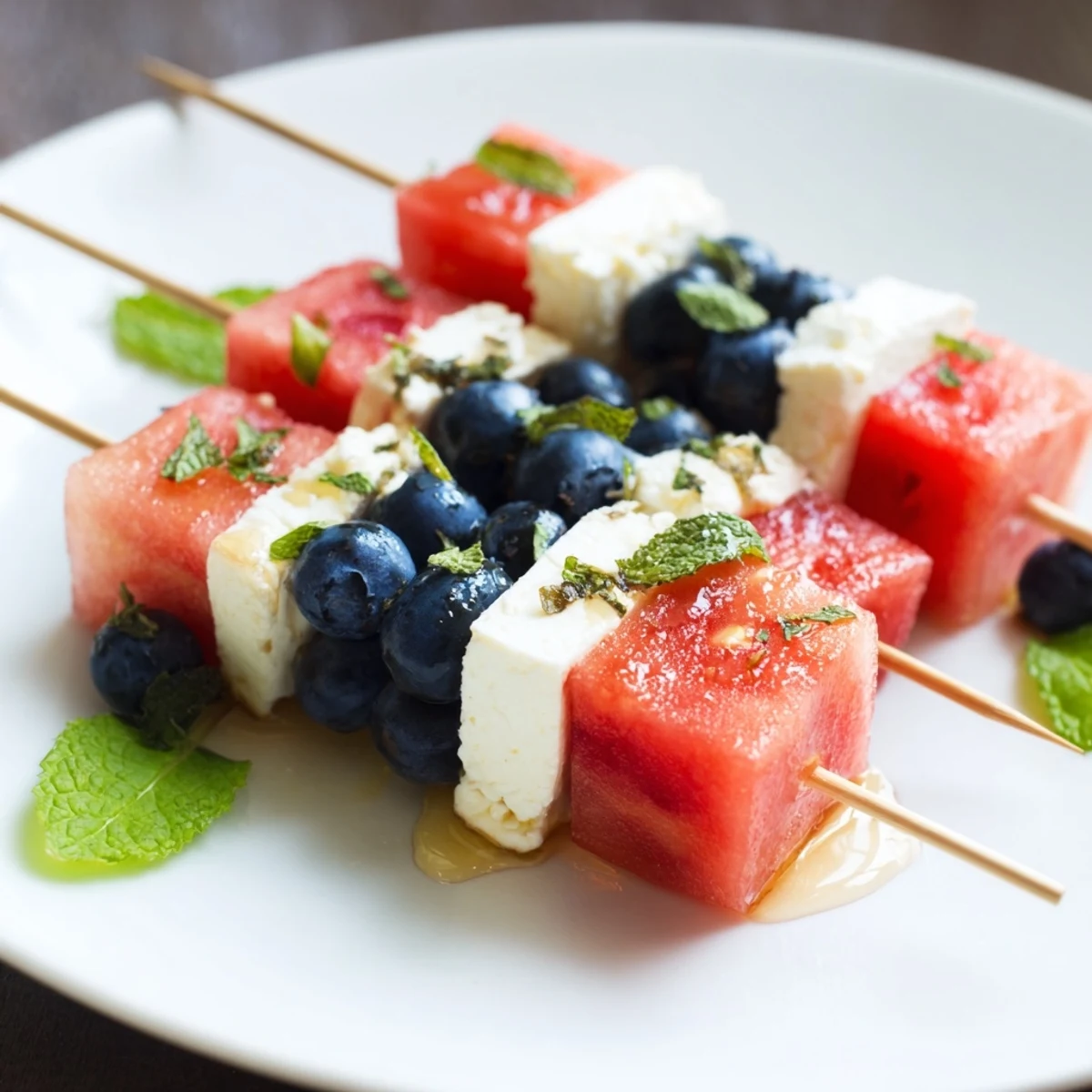 Choose firm, seedless watermelon and pat cubes dry with paper towel before assembling. Keep skewers chilled and assemble close to serving time to preserve texture.