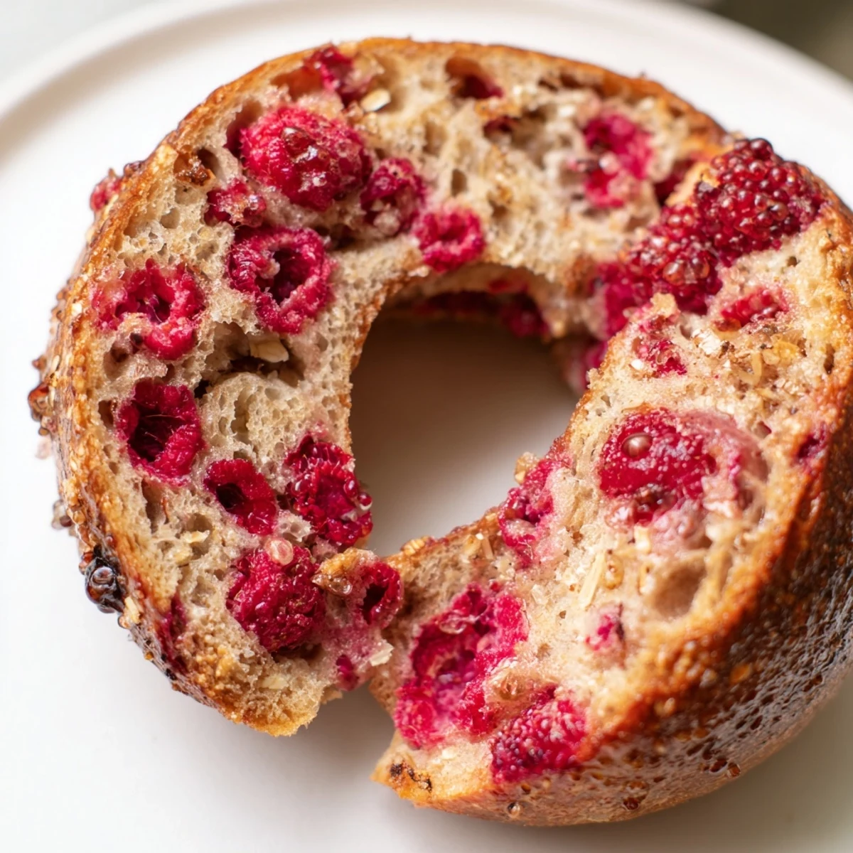 These tangy sourdough bagels combine the complexity of fermented dough with bursts of fresh raspberries. The overnight fermentation develops deep flavor while creating that signature chewy texture bagel lovers crave. Each round gets a quick boil in honey-sweetened water before baking, ensuring the perfect crust and interior. The result is a beautifully marbled creation balancing tart fruit with earthy whole wheat notes. Enjoy them toasted with cream cheese for breakfast or grab one plain for an afternoon snack. The dough can also accommodate blackberries or blueberries if you prefer different berries.