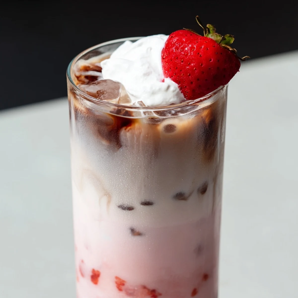 Simply heat strawberries with sugar and water until softened, blend into a smooth puree, then mix with cold milk and cream. Layer over ice in tall glasses and slowly pour chilled coffee over the top for that beautiful marbled effect.