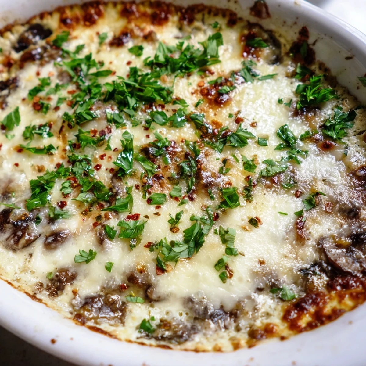 This warm, creamy dip captures all the savory flavors of classic stuffed mushrooms in an easy-to-serve format. Finely chopped cremini mushrooms are sautéed with shallots, garlic, and thyme until golden, then folded into a rich blend of cream cheese, sour cream, mozzarella, and Parmesan. After baking until golden and bubbly, the dip emerges with a slightly crispy top and incredibly smooth interior. The earthy mushrooms pair perfectly with the tangy cheeses, while fresh parsley adds bright notes. Serve this crowd-pleasing appetizer warm with toasted baguette slices, crackers, or crisp vegetable crudites for dipping.